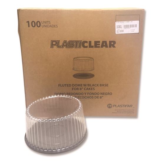 The ideal choice for storing, transporting and displaying cakes and desserts. Transparent domes improve the product's visibility for better appreciation. They are perfect for events, celebrations, supermarkets, bakeries and catering services. Stackable. For 8" Cakes—Clear fluted dome with black base. Food Container Type: Base/Lid Combo; Material(s): PET - Polyethylene Terephthalate; Material Type: Plastic; Interior Volume Capacity: 2 lb.
