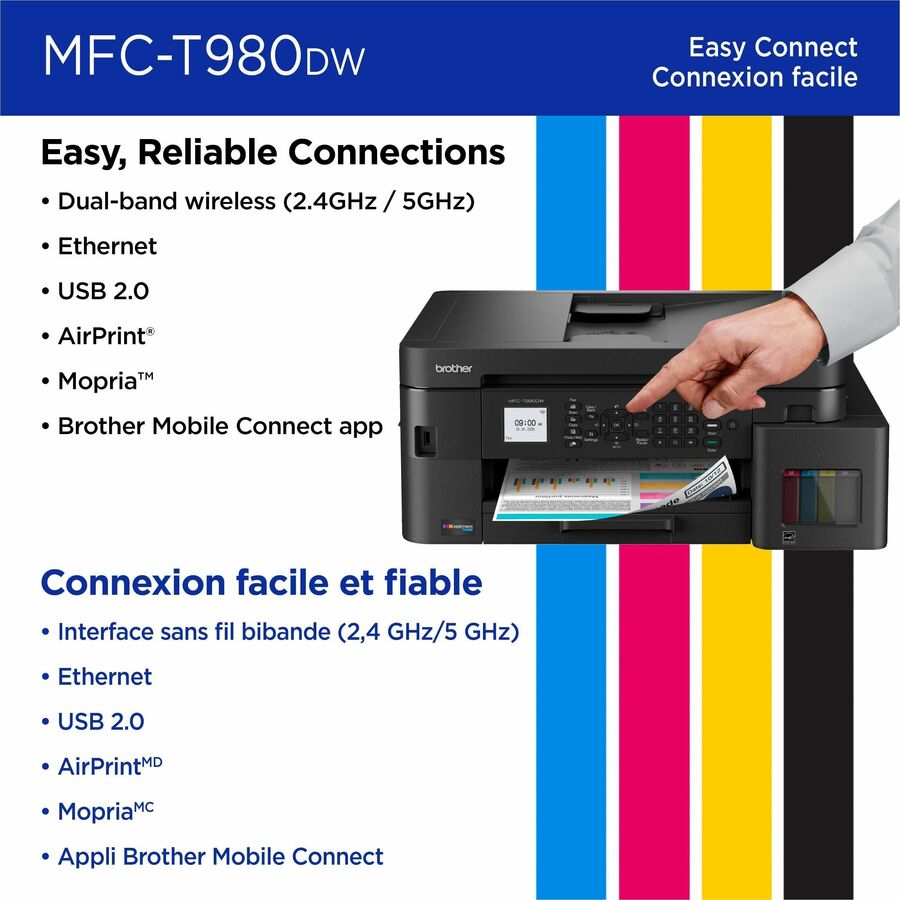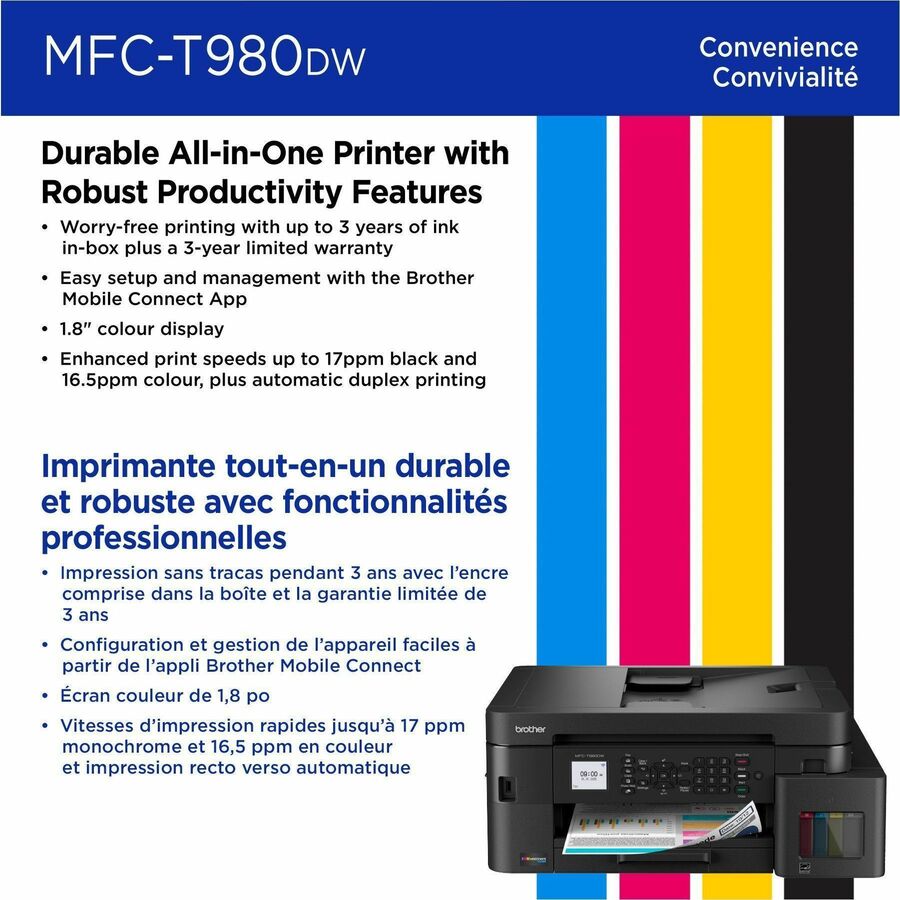 | Marketing Information | With ink value that speaks for itself and reliable productivity-boosting features, the Brother INKvestment Tank 980 Wireless Color Inkjet All-in-One Printer will ensure that your small office or business runs smoothly. Innovative ink tank technology provides an easy-to-replenish solution and includes enough ink to print for up to 3 years?, with spill-free bottles that refill the ink quickly, and a keyed design that prevents adding the incorrect color to each slot. For all your business and personal printing needs, from business presentations to airline tickets, this printer includes convenience-driven features like a single-sided automatic document feeder (ADF), 150-sheet paper tray?, and 80-sheet multipurpose tray? for flexible paper handling. Plus ethernet or wireless connectivity? and the ability to print from virtually anywhere with the Brother Mobile Connect app?. Produce beautiful prints in vibrant color and bold blacks at fast print speeds with Brother Genuine BTD180 Ink bottles - the only brand we recommend for your Brother printer. |