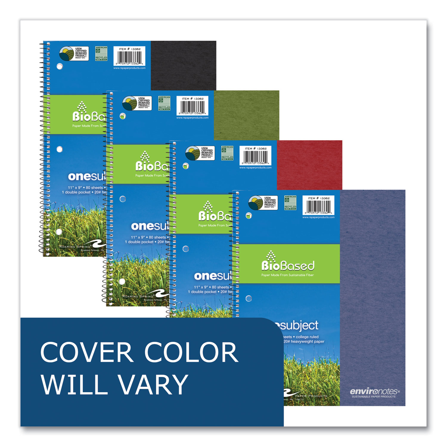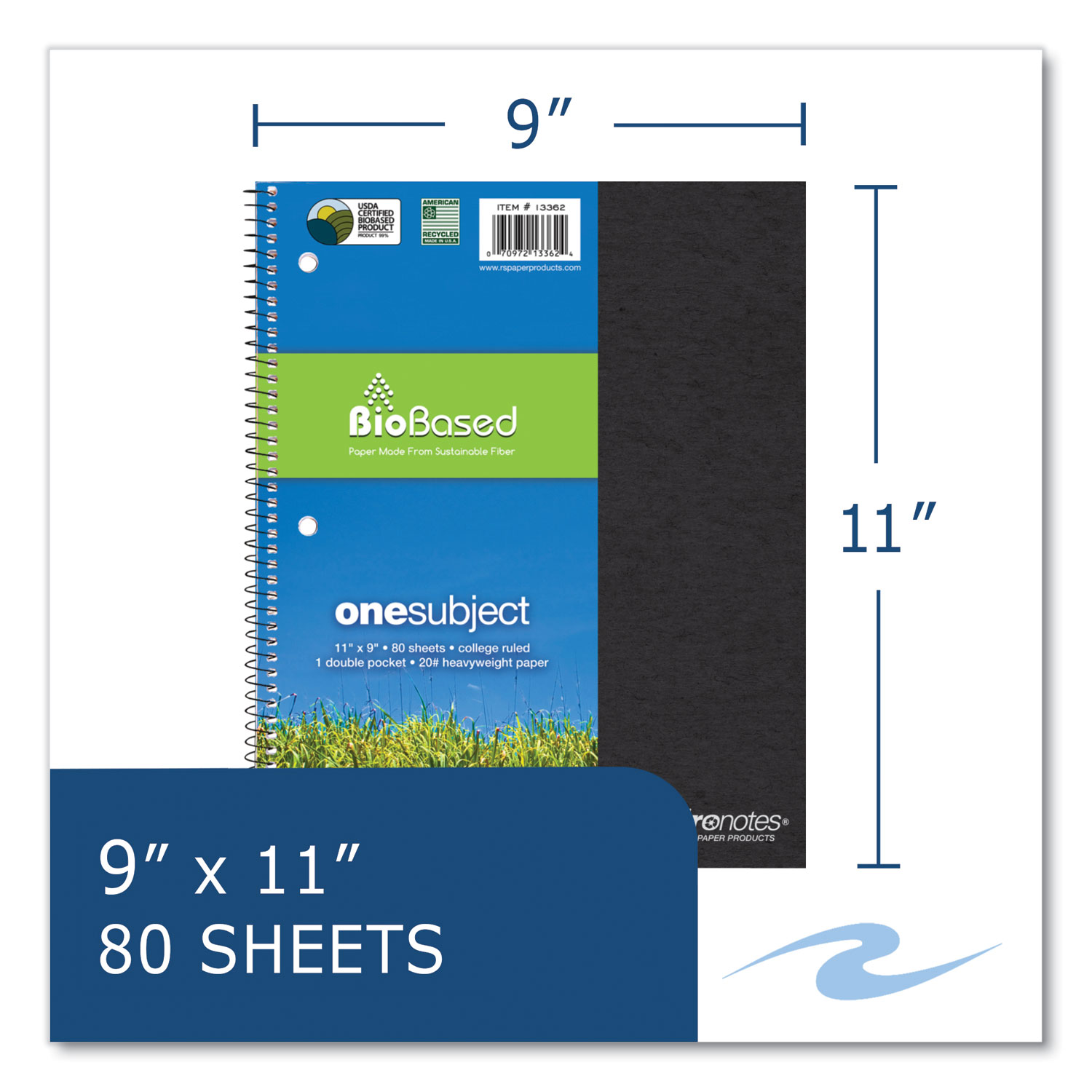 Environotes wirebound notebook. Smooth, white, writing paper is college ruled with a red margin line. Paper is produced from Sugarcane fiber, a sustainable post-agricultural paper. Paper is high-performance 20 lb allowing writing on both sides. Covers are produced from high-recycled content 25-point Reprise board. Wire ends are coil-locked for snag-proof performance. Pocket-Sized Indicator: N; Book-Binding Type: Spiral Coil; Book-Binding Details: Coli-Lock; Book-Binding Edge: Side.