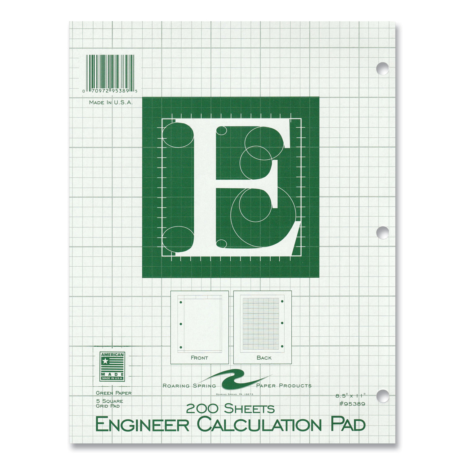 Excellent pad for usage in engineering classes and labs. Smooth writing paper is plain, except for printed outline box on top of sheet, and has 5 square/inch grid layout printed on back of sheet. Back grid shows through to front as dimensional guide for drawings and layouts. 34 pt chipboard backs add stability. Glued along 8.5" (top) edge and 3-hole punched to fit in standard 3-ring binders. Each pad is poly-wrapped. Front-Face Frame-Format—Three header blocks and 0.5" margins left and right. Pad-Binding Type: Glued; Pad-Binding Edge: Top; Sheets per Pad: 200; Sheet Size (Bound-Side First): 8.5 x 11.