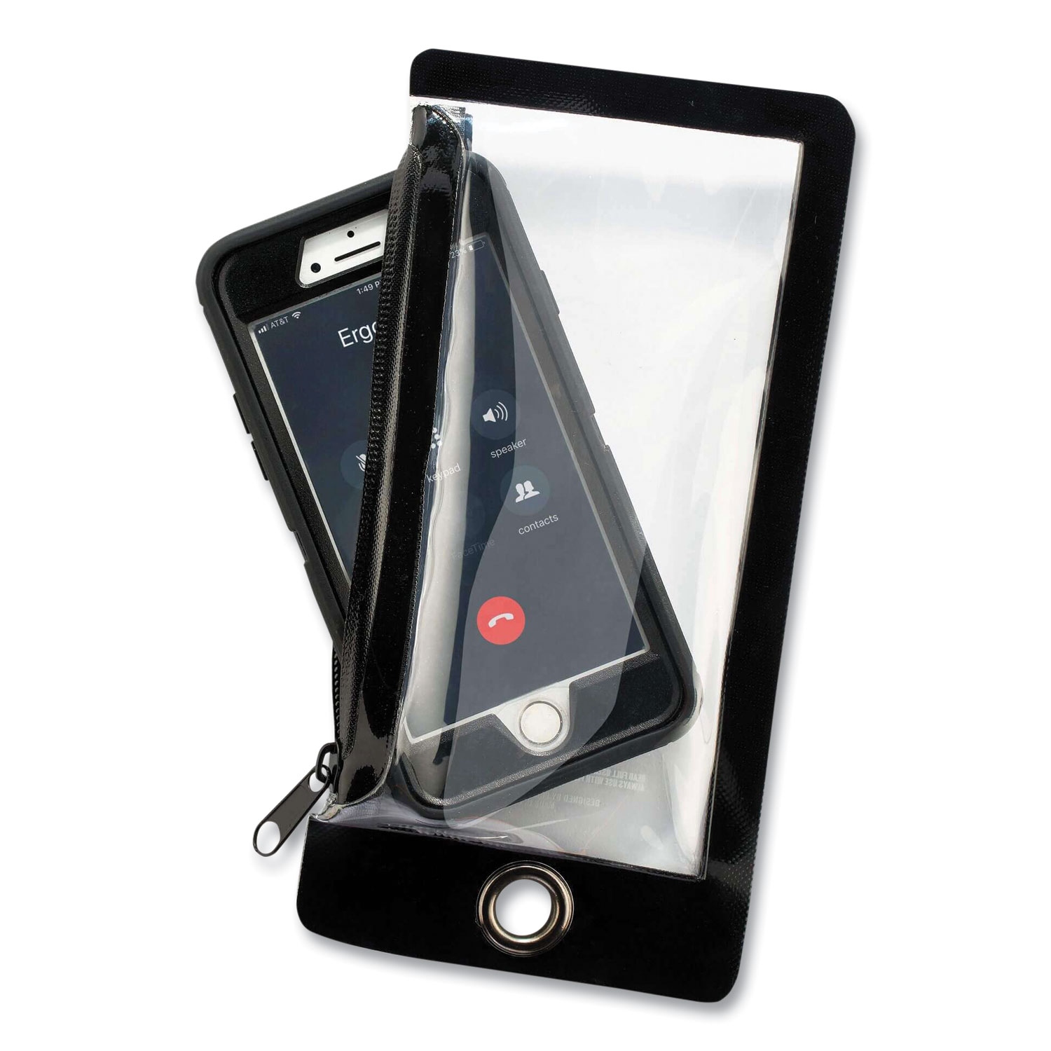 This water resistant phone pouch and trap makes it easy to carry and use your cell phone on the job while preventing dropped objects when working at heights.This cell phone pouch is made of a clear touchscreen material that provides protection while still allowing touchscreen use and access to both the front and rear cameras of smartphones. The heavy-duty, easy-to-use zipper closure system safely secures the device inside the cell phone holder. There is a steel grommet/ring on the bottom to attach a tool lanyard for a complete tethering system. The sides of the smartphone pouch are made of heavy-duty, water-resistant reinforced tarpaulin, making it perfect for the harshest work environments. The smartphone sleeve is also great for the beach, boating, fishing, water-theme parks, camping, hiking or any other outdoor activity. Protect your phone from rain, snow, dirt, dust and sand.