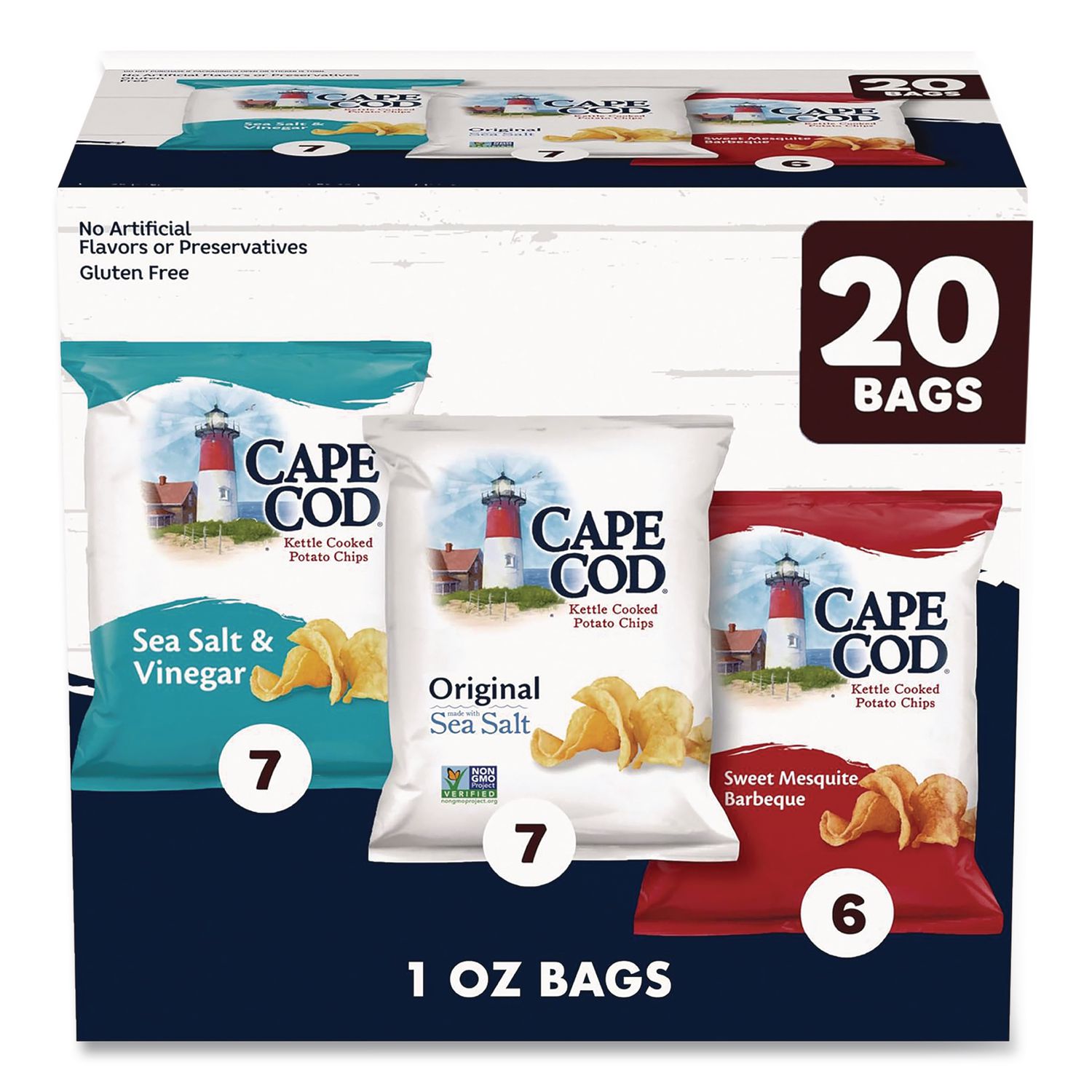 Get all of CAPE COD® kettle chips top flavors in a delicious, variety pack: Sea Salt & Vinegar, Original Sea Salt, and Sweet Mesquite Barbeque. Choice potatoes are sliced perfectly and cooked in custom kettles. Unique shapes and folds mean one-of-a-kind chips that share that wonderful CAPE COD® crunch. Food Type: Chips; Flavor: (7) Sea Salt & Vinegar; (6) Sweet Mesquite Barbeque; (7) Original Sea Salt; Capacity (Weight): 1 oz; Sugar Free: No.