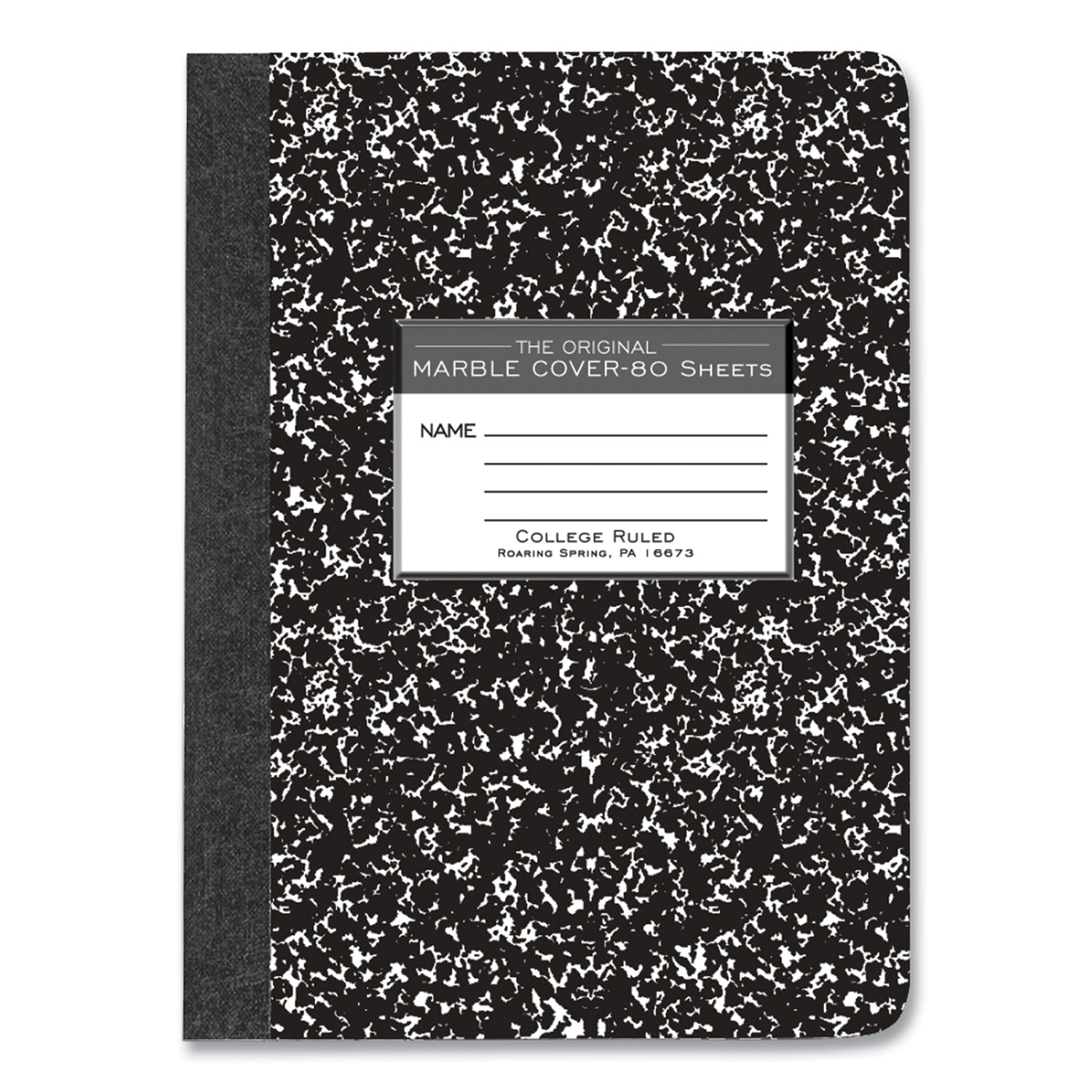 Record your notes in this permanently bound composition book. Paper is smooth writing paper. Covers are a hard white board that are printed in the traditional marble pattern. Inside of covers is printed with class schedule and other useful information. Each book is produced with center-sewn and tape bound construction, not designed for sheet tear-out. Pocket-Sized Indicator: N; Book-Binding Type: Taped; Sewn; Book-Binding Edge: Side; Cover Color: Black Marble