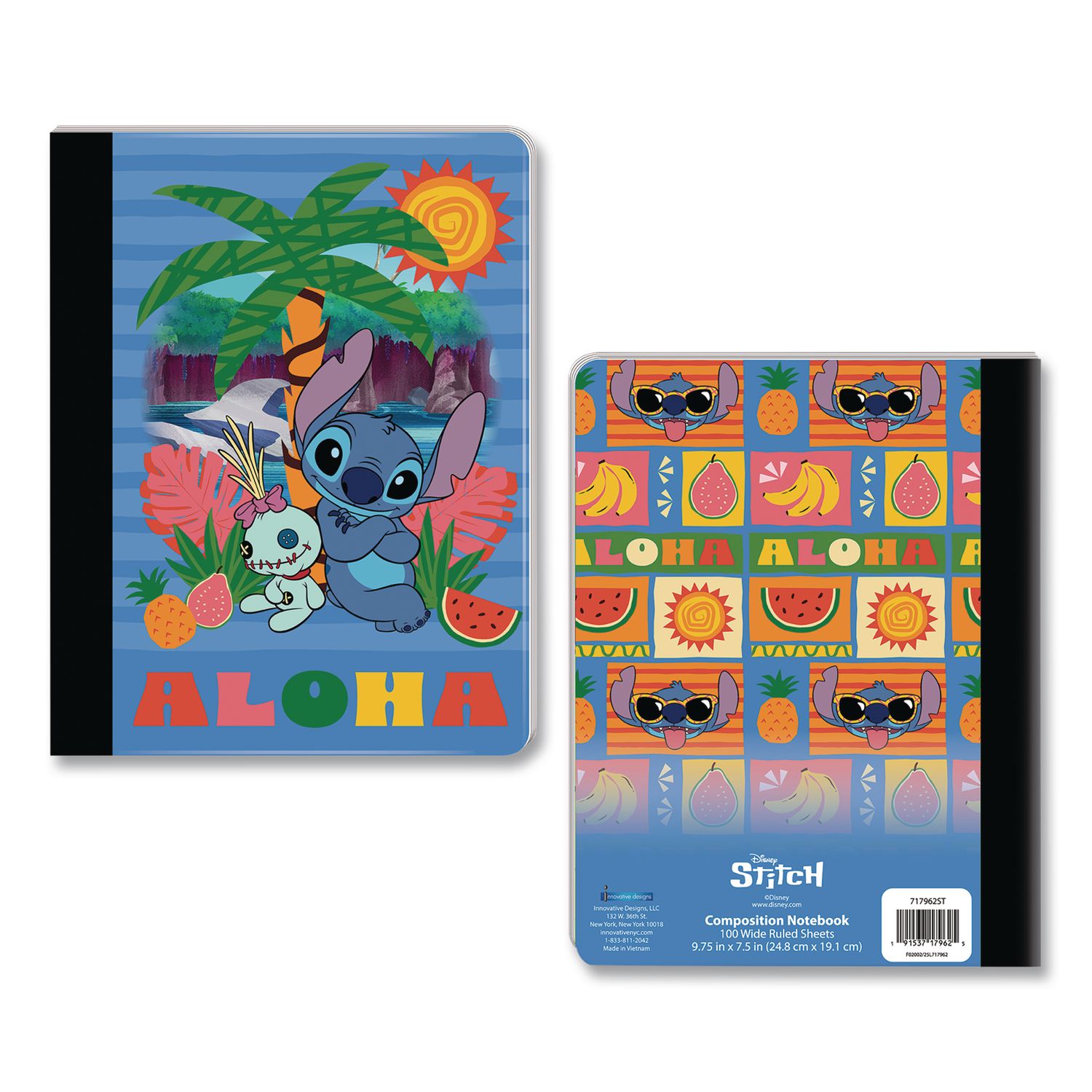 Bring your favorite characters to school with you. Each Licensed Composition Book from Innovative Designs features a colorful, action-packed cover depicting a range of characters taken from popular movies, cartoons, video games, comic books and more. Ideal for schoolwork, the covers are also laminated to keep up with busy students throughout the school year. Heavier weight, high-quality paper minimizes the potential for ink bleed through, and tape-reinforced sewn binding keeps the pages securely in place. Pocket Sized: No; Book-Binding Type: Sewn; Taped; Book-Binding Edge: Side; Cover Design/Theme: Disney Stitch - Aloha.