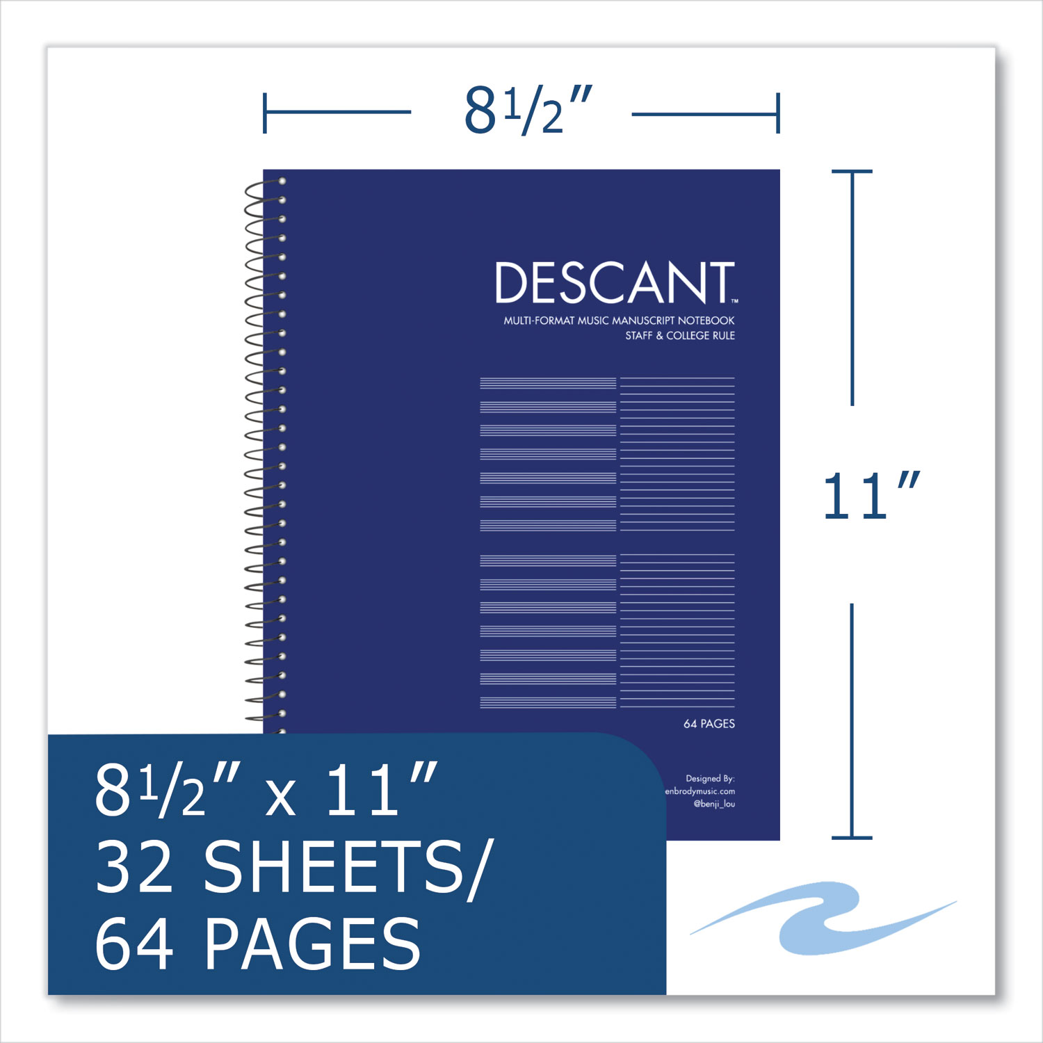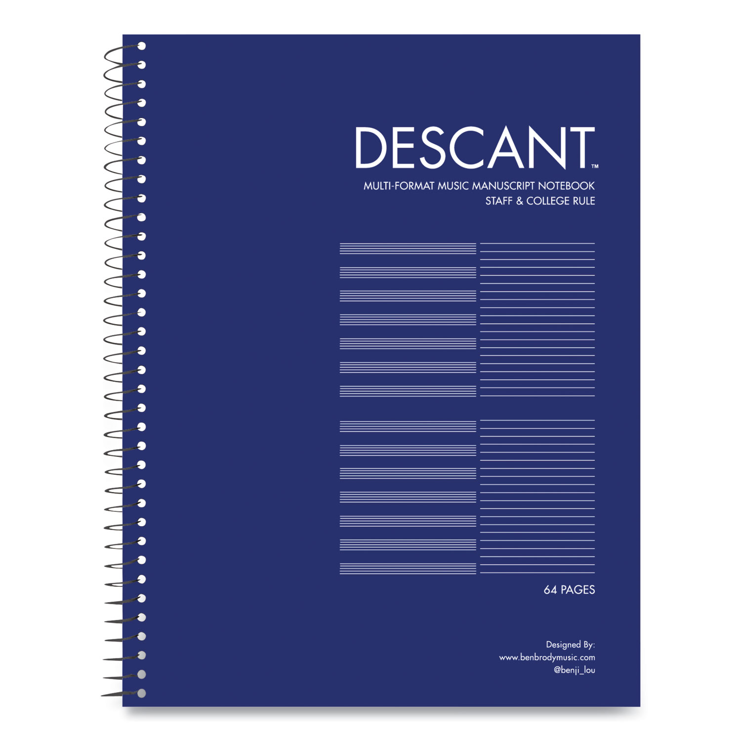 DESCANT notebooks are a multi-format, two-column music tool that combine traditional music manuscript paper with ruled notebook paper. Simple yet effective, this concept was developed by a Manhattan School of Music undergraduate to more efficiently organize theory notes and new ideas while orchestrating compositions in development. This multi-format notebook can help anyone streamline notes, organize sketches, coordinate arrangements and methodically construct scores. In addition to being an efficient composing and arranging tool for professional musicians and artists, the DESCANT notebook is also a fantastic teaching and learning tool for intermediate students and beginners. Two-Column Format—Column One features (12) unformatted music staves; Column Two features (40) medium/college note-rule lines. Pocket-Sized Indicator: No; Book-Binding Type: Spiral Coil; Book-Binding Edge: Side; Cover Color: Blue.