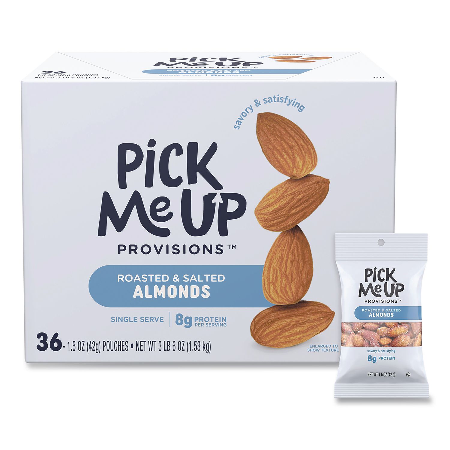 Enjoy a satisfying snack and delight in the savory-salty goodness of Pick Me Up Provisions™ Roasted & Salted Almonds. Not only are they a great way to satisfy salty cravings, but each serving is also packed with 8 g of protein, making them a nutritious choice that also gives you a quick energy boost. Made with just a few simple ingredients, you can trust in the quality and taste of these ready-to-eat snacks. Keep them on hand so it's easy to keep going whenever hunger strikes. Food Type: Nuts; Flavor: Roasted & Salted; Capacity (Weight): 1.5 oz; Sugar Free: No.