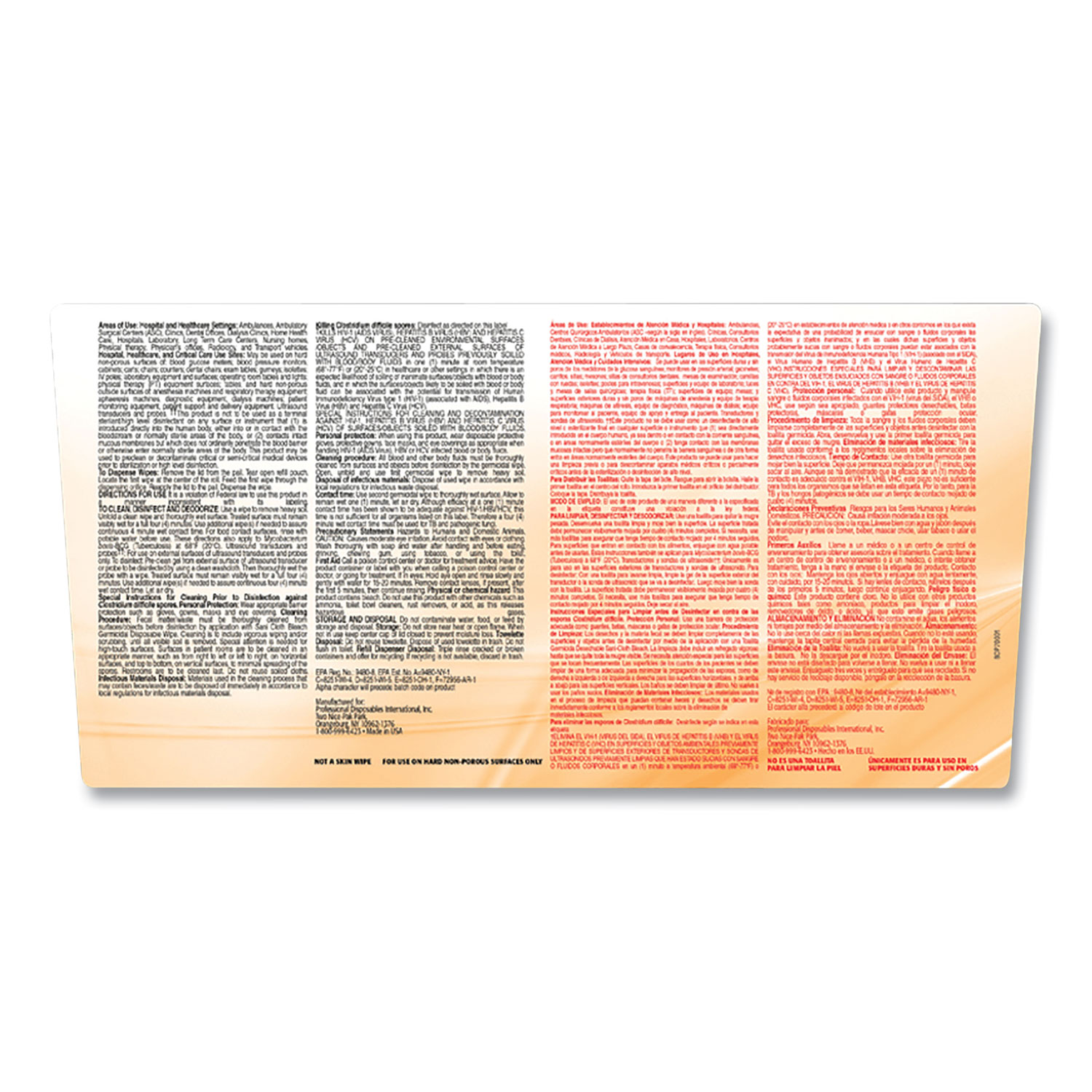 Pre-moistened, ready-to-use wipes are ideal for cleaning and disinfecting high-risk areas in one easy step. Bleach-based germicide eliminates 50 varieties of viruses, bacteria and fungi in four minutes or less, including multi-drug resistant bacteria, Clostridium difficile spores, Norovirus and tuberculosis. Clear- and clean-drying formula works wonderfully in all environments, from examination and patient rooms to kitchens and bathrooms. Prominent contact time labeling on all packaging types enables easy identification for improved compliance with accreditation standards. Towel/Wipe Type: Disinfecting Wipes; Application: Hospitals; Medical Facilities; Nursing Homes; Applicable Material: Hard Nonporous Surfaces; Medical Equipment; Chemical Compound: Sodium Hypochlorite.
