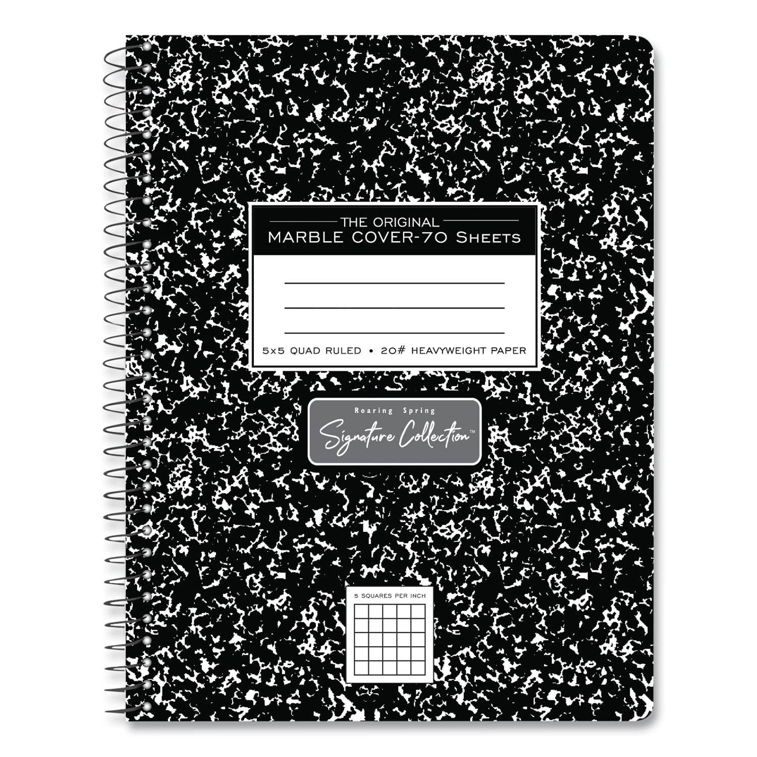 The Roaring Spring Signature Collection includes premium features such as rounded corners, lay flat design, and heavy weight perforated paper. Record your notes in this special spiral wire bound composition book. Paper is premium 20# writing paper. Pages are micro perforated for clean and easy tear outs. Cover is printed in the traditional black marble pattern. Pocket-Sized Indicator: N; Book-Binding Type: Taped; Sewn; Book-Binding Edge: Side; Cover Color: Black Marble