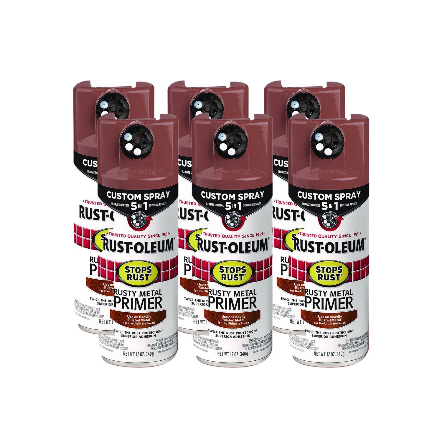 Rust-Oleum Stops Rust Custom Spray 5-in-1 allows you to choose between five different spray patterns for ultimate control and confidence over your next project. The advanced Stops Rust formula provides 30% greater corrosion resistance and color retention compared to original matching Stops Rust colors with standard tip. Ideal for ferrous, nonferrous metal and wood surfaces. Not for use on galvanized metal. Paint Sub-Category: Primer; Intended Application Environment: Interior/Exterior; Color(s): Rusty Metal; Color Family: Brown.
