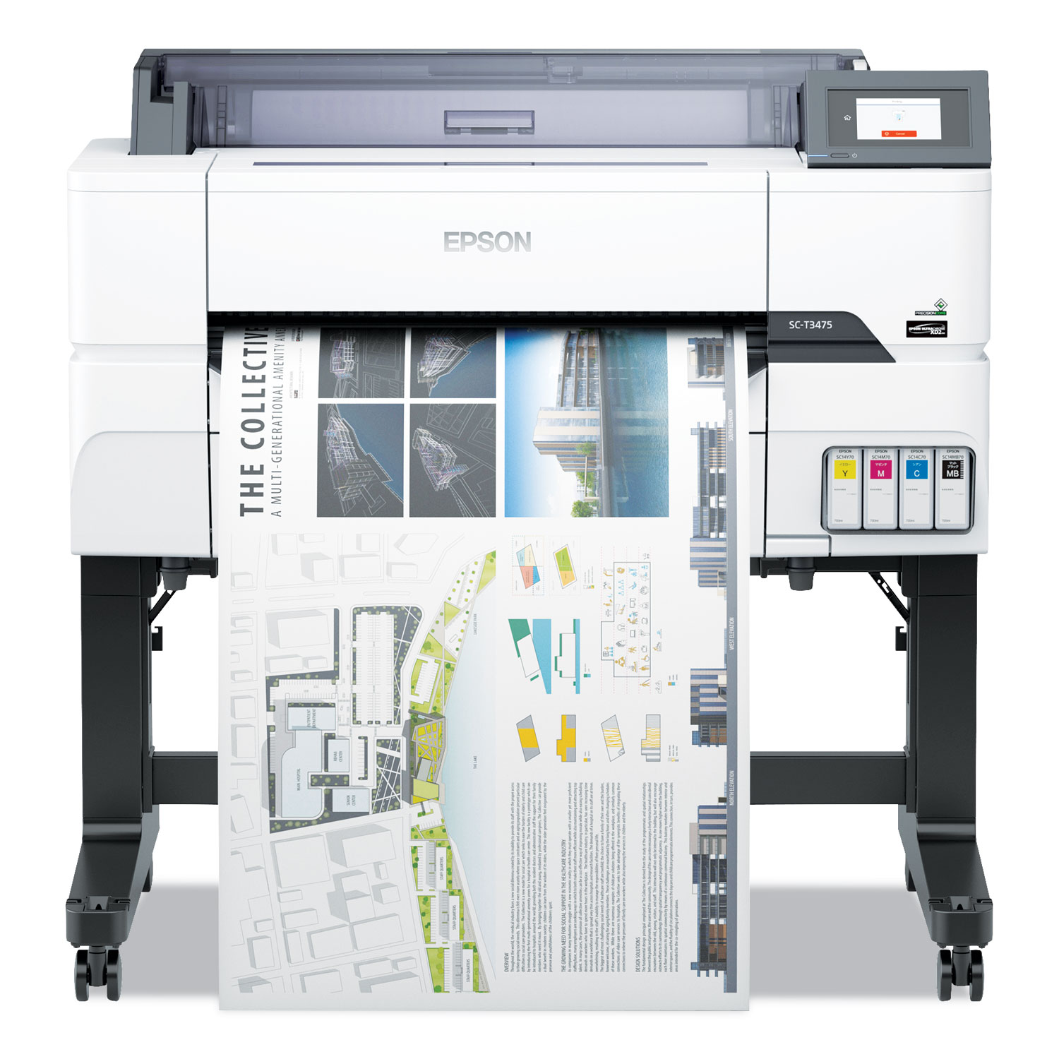 Rethink workgroup productivity with the 24" SureColor T3475 wide-format wireless printer, offering powerful, precise printing within a compact, robust design. Ideal for high-production printing of blueprints, line drawings and posters up to 24", it delivers accurate, A1/D-size prints in as fast as 25 seconds. Featuring a 4.3" color touchscreen, this easy-to-use printer also offers advanced network security and encryption designed to safeguard sensitive information. Its high-capacity UltraChrome® XD2 pigment inks ensure durable, vibrant prints. Plus, Epson's breakthrough PrecisionCore® MicroTFP printhead achieves outstanding clarity and commercial-grade reliability. Print Resolution (Black) (Width x Height): 2400 x 1200 dpi; Print Resolution (Color) (Width x Height): 2400 x 1200 dpi; B&W or Color Output: Color; Printing Type: Wide Format Inkjet.
