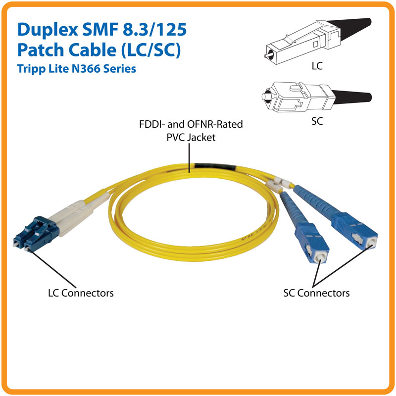 Tripp Lite N366-25M. Cable length: 984.3" (25 m), Cable type: OFNR, Connector 1: 2x LC, Connector 2: 2x SC, Core diameter: 8.3 µm